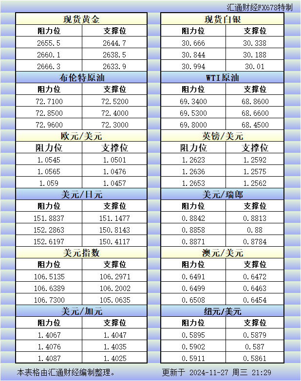 11月27日美市更新的支撑阻力:金银原油+美元指数等八大货币对