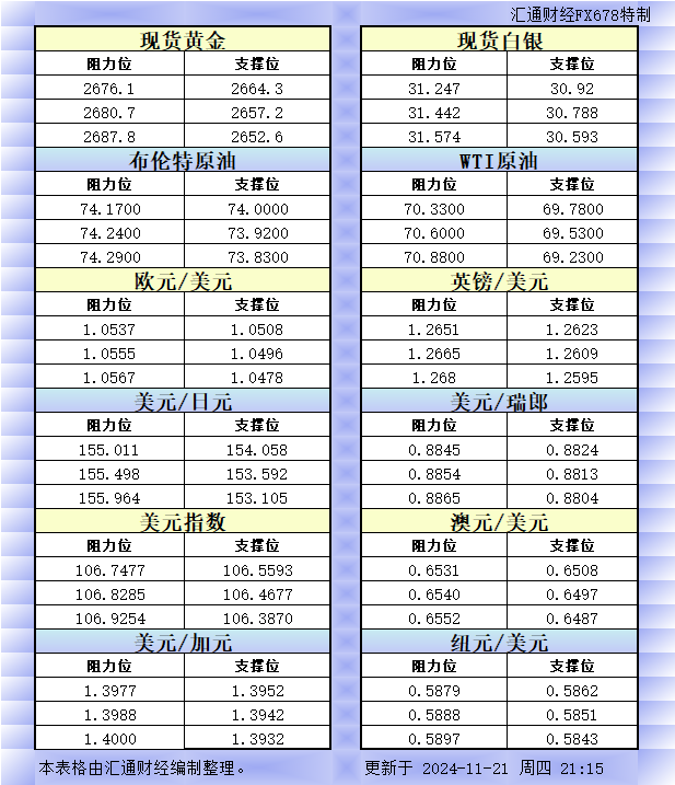 11月21日美市更新的支撑阻力:金银原油+美元指数等八大货币对