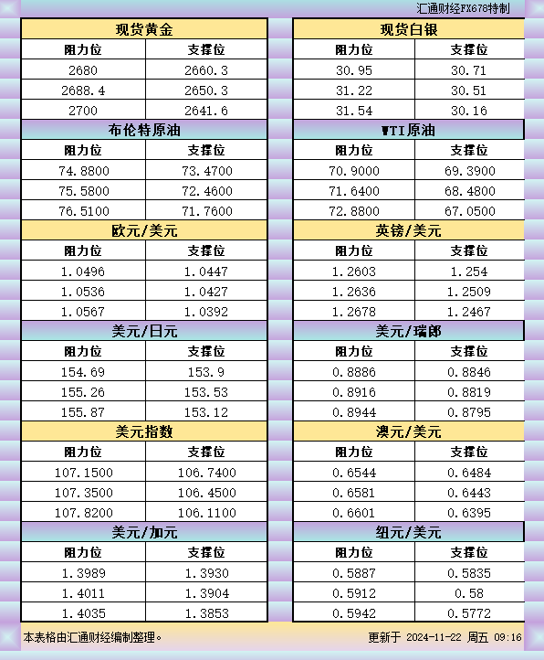 11月22日亚市支撑阻力:金银原油+美元指数等六大货币对