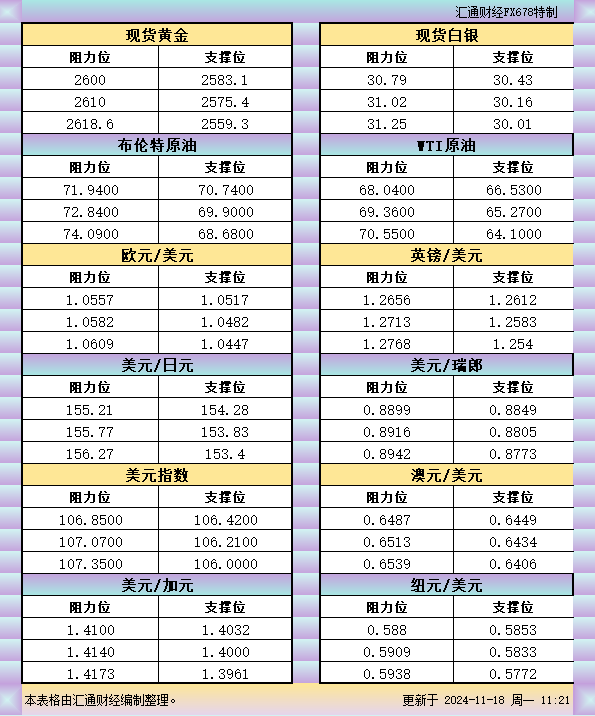 11月18日亚市支撑阻力:金银原油+美元指数等六大货币对