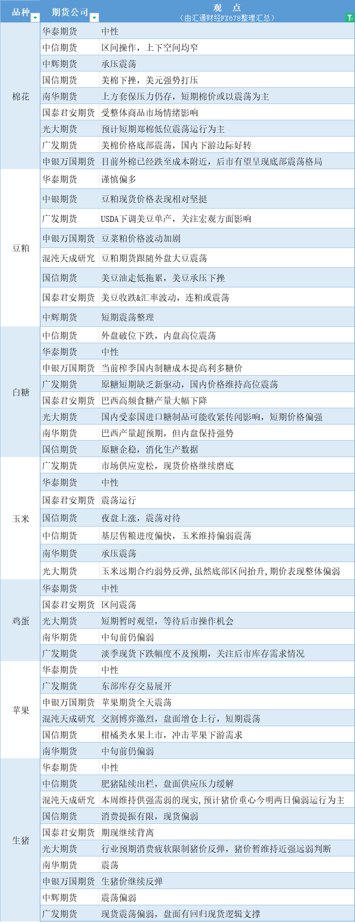 期货公司观点汇总一张图:11月13日农产品(棉花、豆粕、白糖、玉米、鸡蛋、生猪等)