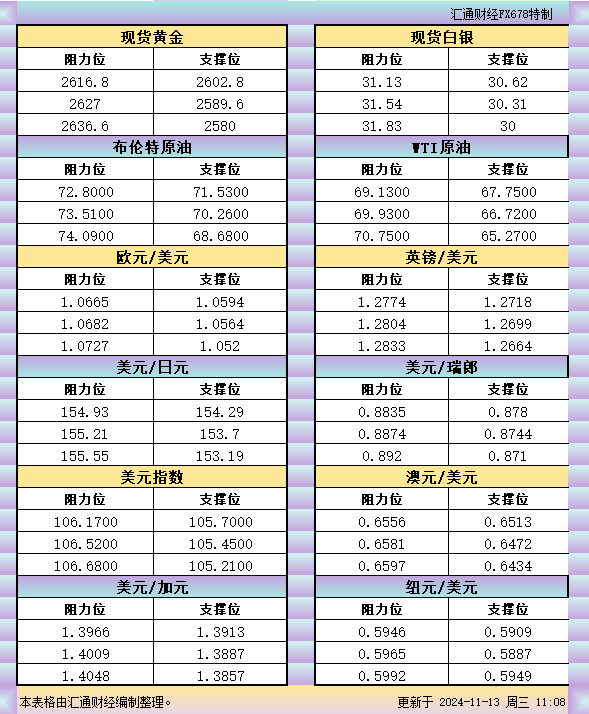 11月13日亚市支撑阻力:金银原油+美元指数等六大货币对
