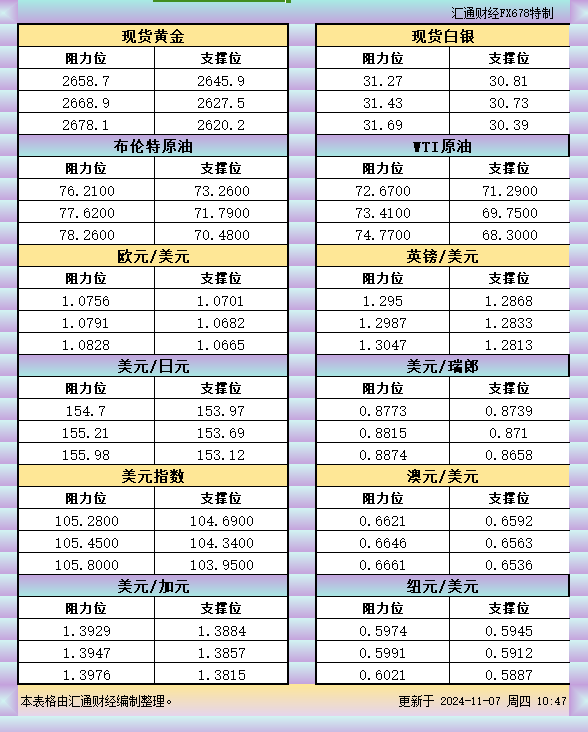 11月7日亚市支撑阻力:金银原油+美元指数等六大货币对