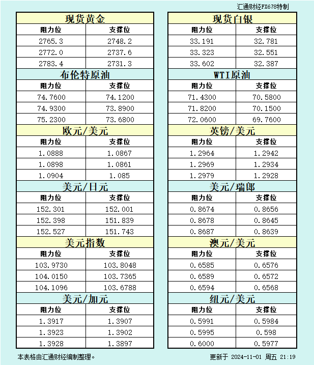 11月1日美市支撑阻力:金银原油+美元指数等八大货币对