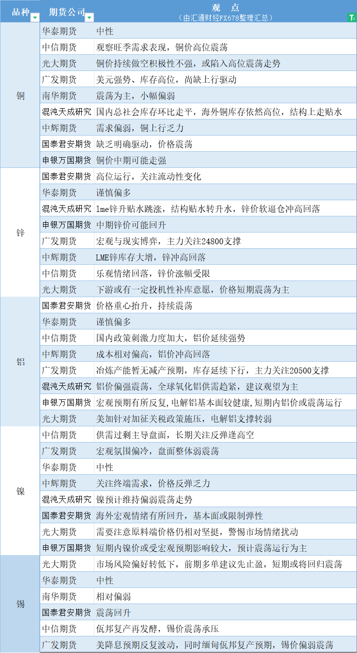 期货公司观点汇总一张图:10月25日有色系(铜、锌、铝、镍、锡等)
