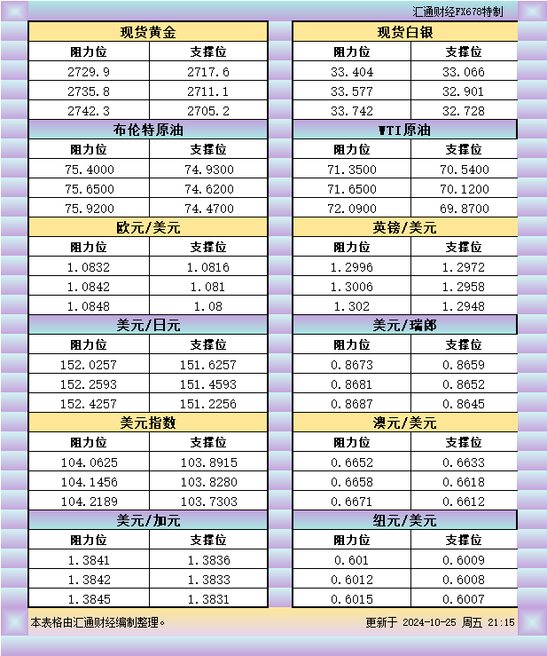10月25日美市支撑阻力:金银原油+美元指数等八大货币对