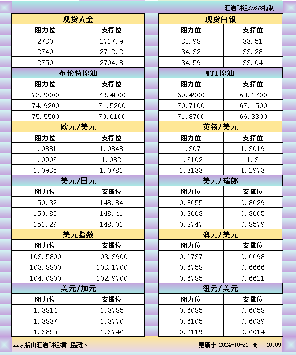 10月21日亚市支撑阻力:金银原油+美元指数等六大货币对