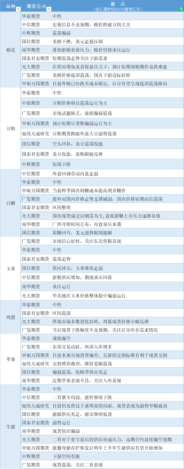 期货公司观点汇总一张图:10月18日农产品(棉花、豆粕、白糖、玉米、鸡蛋、生猪等)