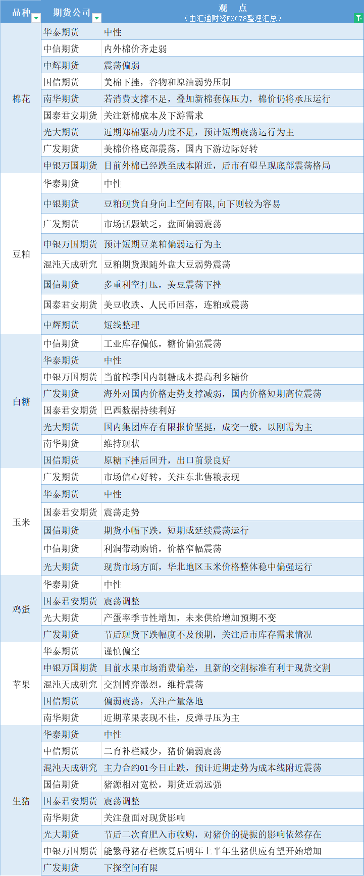 期货公司观点汇总一张图:10月16日农产品(棉花、豆粕、白糖、玉米、鸡蛋、生猪等)