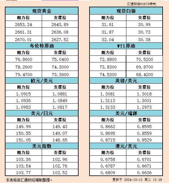 10月15日亚市支撑阻力:金银原油+美元指数等六大货币对
