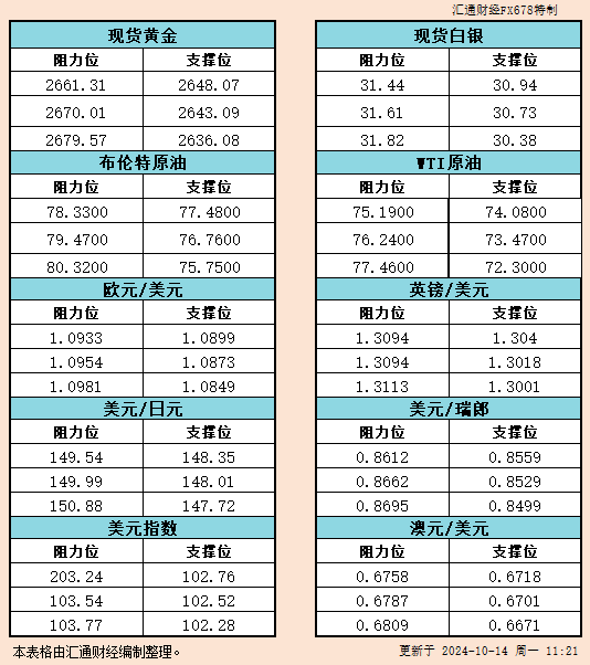 10月14日亚市支撑阻力:金银原油+美元指数等六大货币对