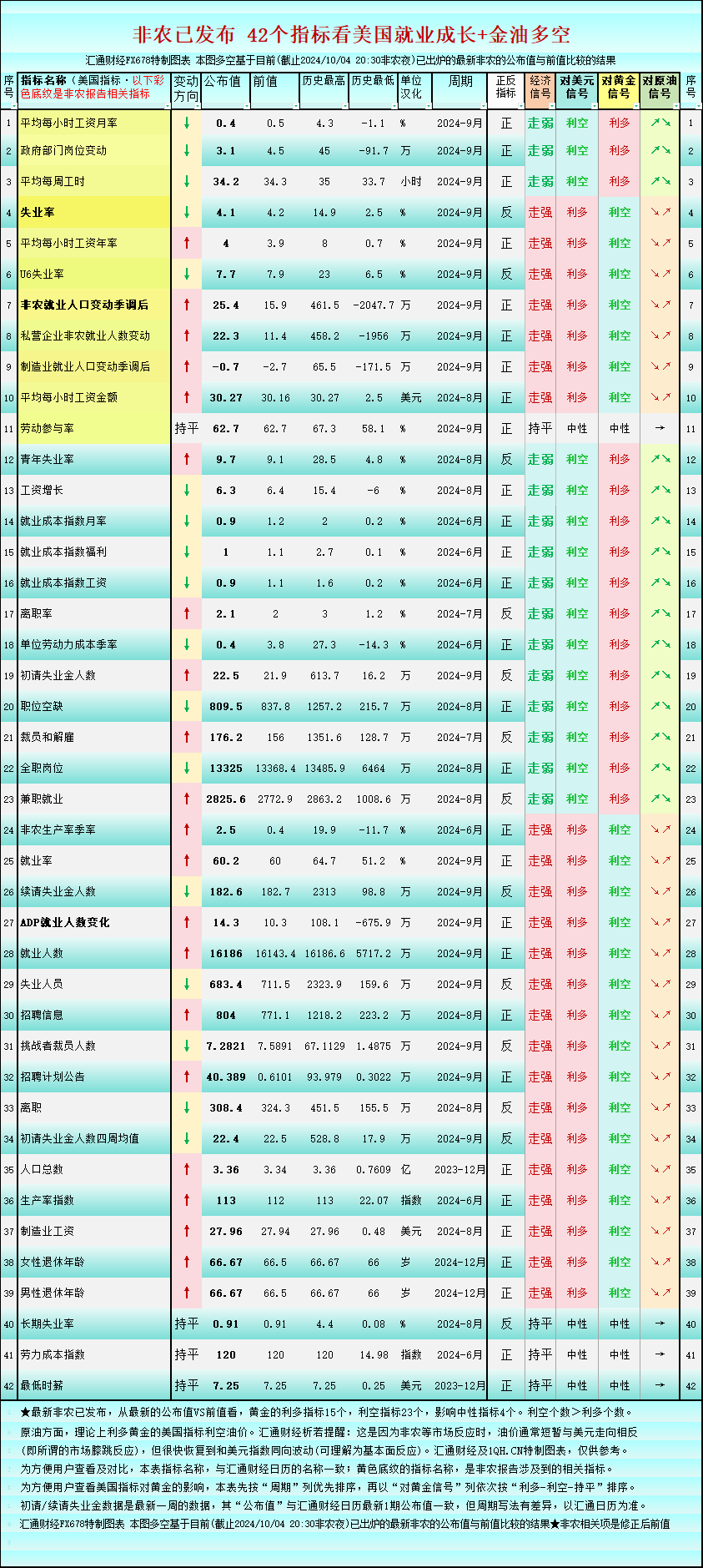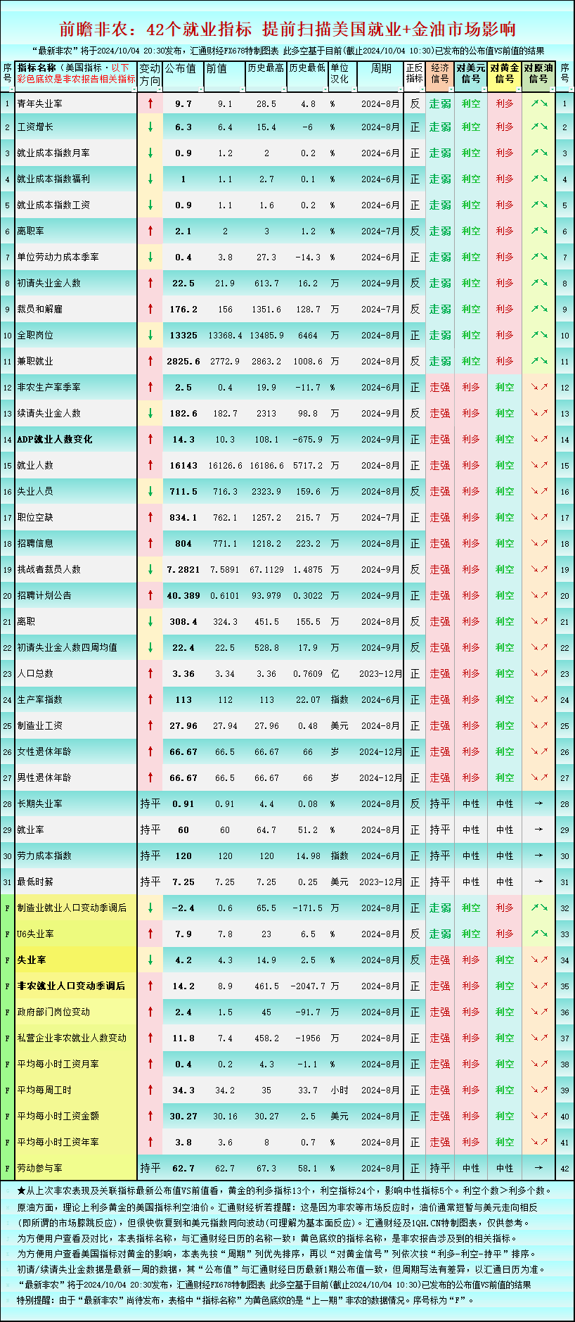 一张图前瞻9月非农:42个就业指标,利多黄金的仅13个