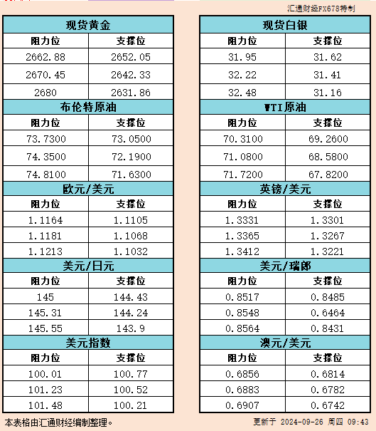 9月26日亚市支撑阻力:金银原油+美元指数等六大货币对