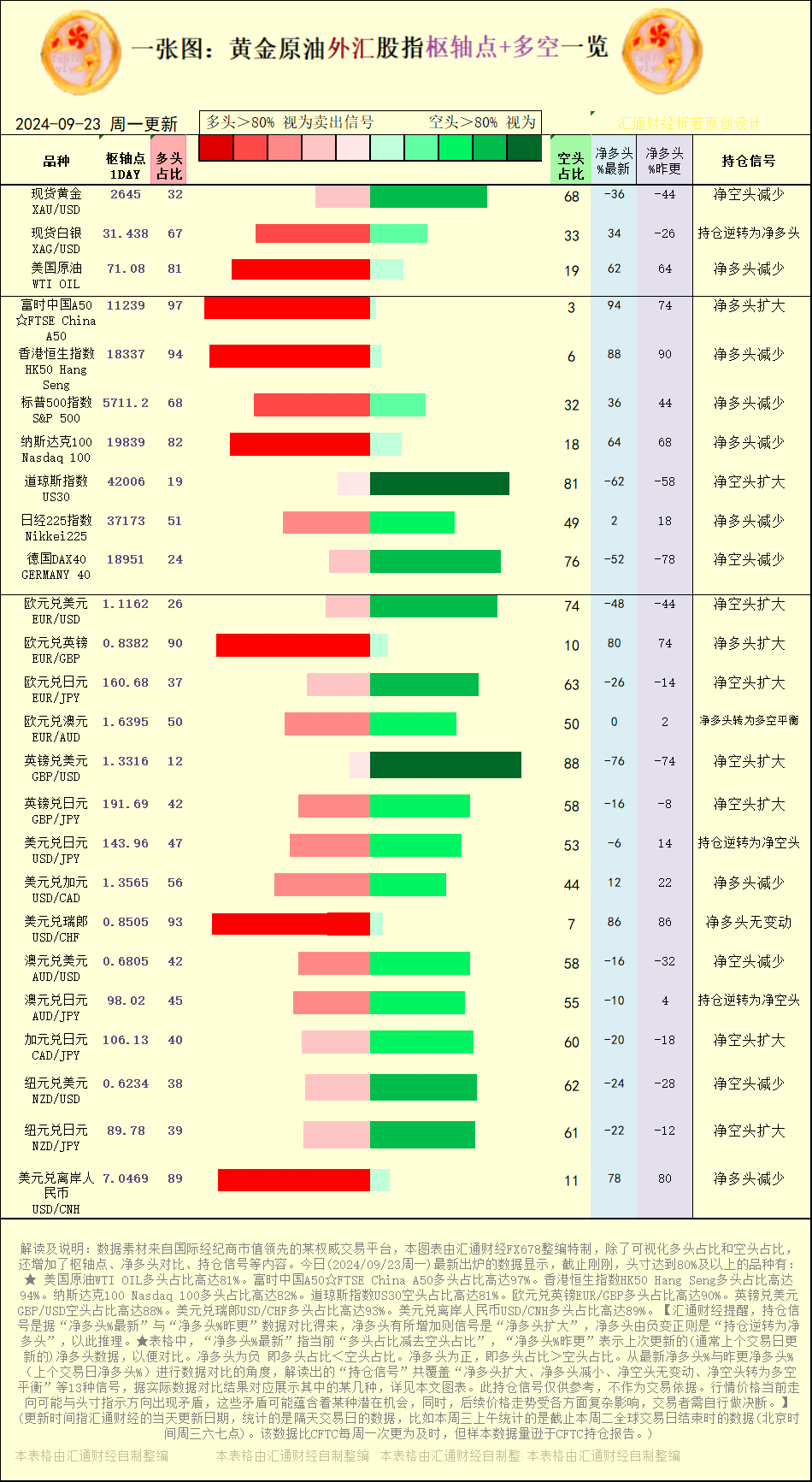 一张图:2024/9/23黄金原油外汇股指“枢纽点+多空持仓信号”一览