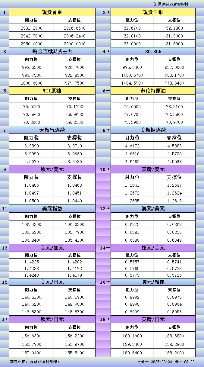 2月24日亚市更新支撑阻力:18品种支撑阻力(金银铂钯原油天然气铜及十大货币对)