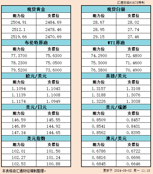 9月2日亚市支撑阻力:金银原油+美元指数等六大货币对