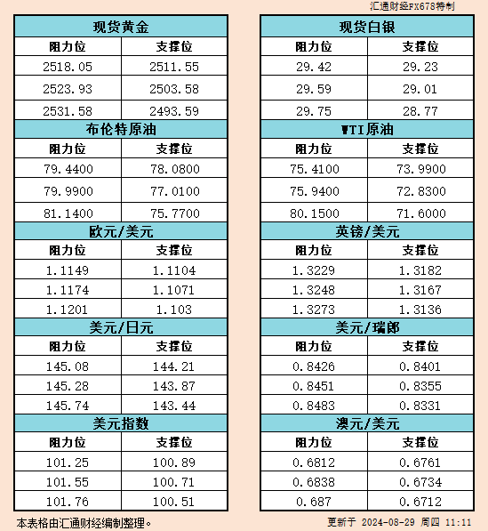 8月29日亚市支撑阻力:金银原油+美元指数等六大货币对