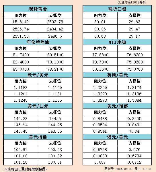 8月27日亚市支撑阻力:金银原油+美元指数等六大货币对