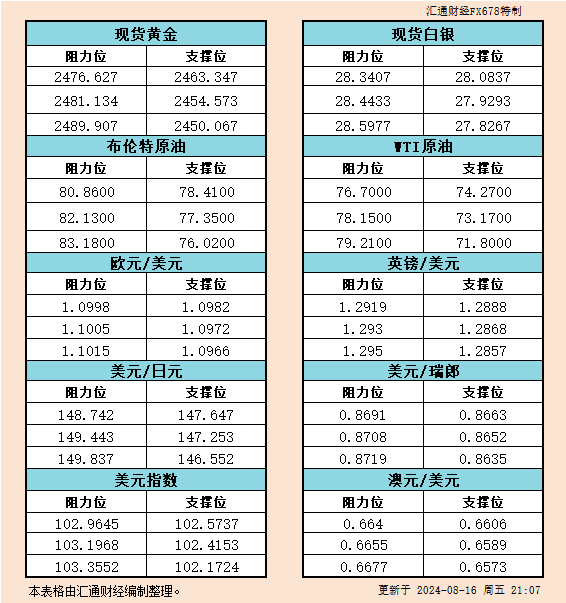 8月16日美市支撑阻力:金银原油+美元指数等六大货币对