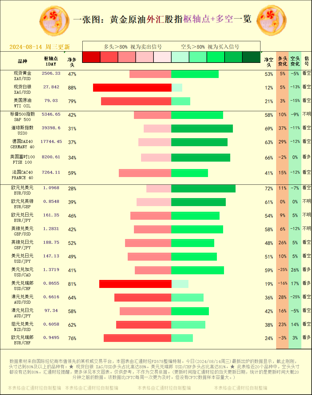 一张图:2024/08/14黄金原油外汇股指"枢纽点+多空占比"一览