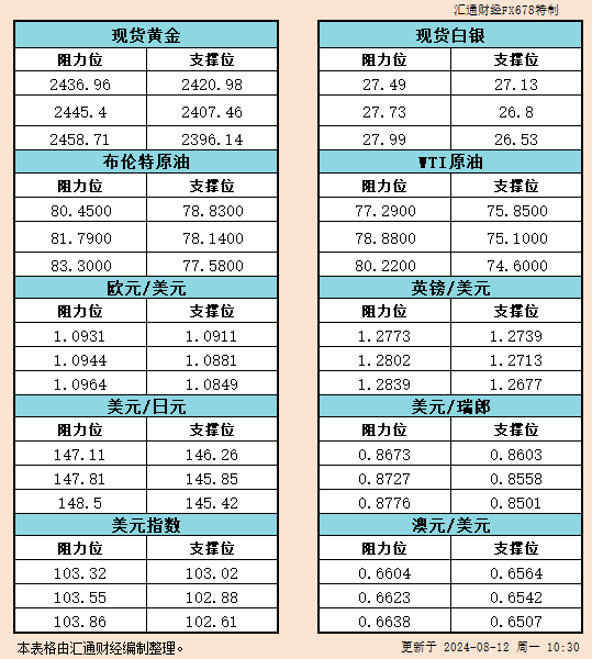 8月12日亚市支撑阻力:金银原油+美元指数等六大货币对