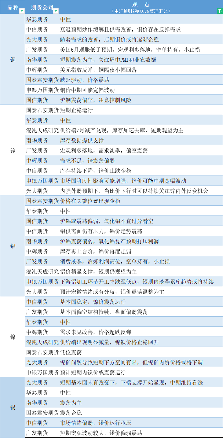 期货公司观点汇总一张图:7月30日有色系(铜、锌、铝、镍、锡等)
