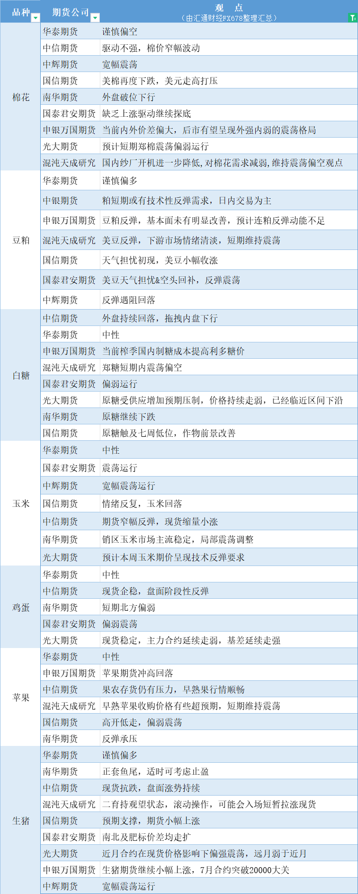 期货公司观点汇总一张图:7月24日农产品(棉花、豆粕、白糖、玉米、鸡蛋、生猪等)