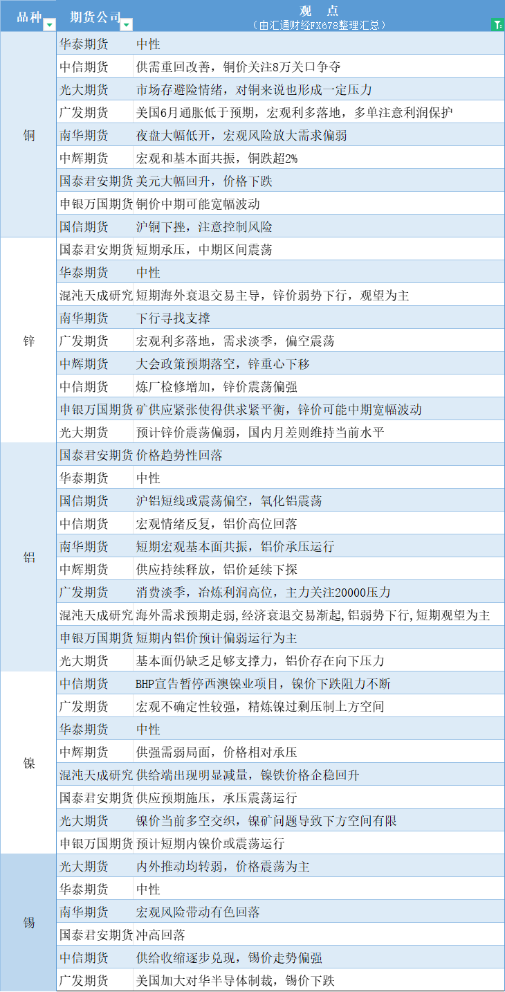 期货公司观点汇总一张图:7月19日有色系(铜、锌、铝、镍、锡等)