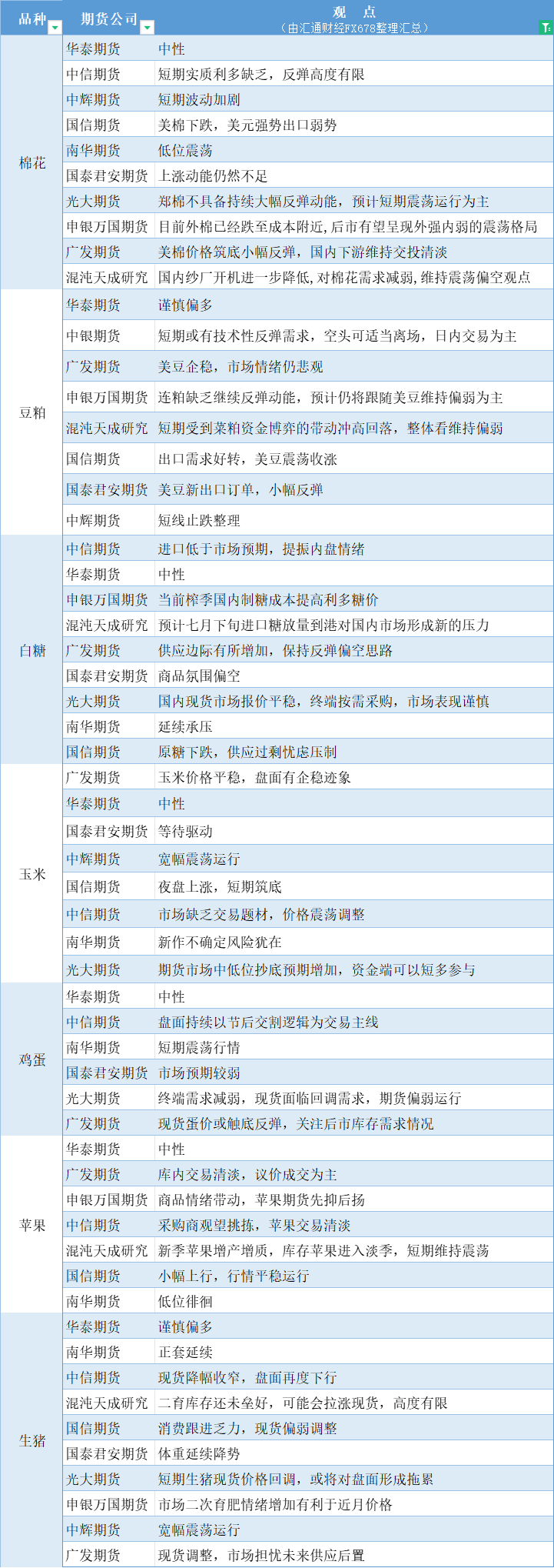 期货公司观点汇总一张图:7月19日农产品(棉花、豆粕、白糖、玉米、鸡蛋、生猪等)