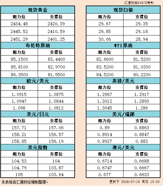 7月19日美市支撑阻力:金银原油+美元指数等六大货币对