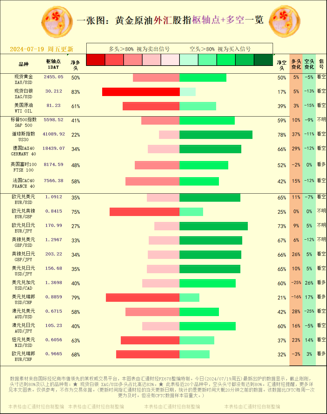 一张图:2024/07/19黄金原油外汇股指"枢纽点+多空占比"一览