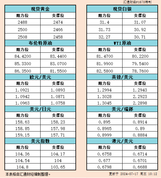 7月17日亚市支撑阻力:金银原油+美元指数等六大货币对