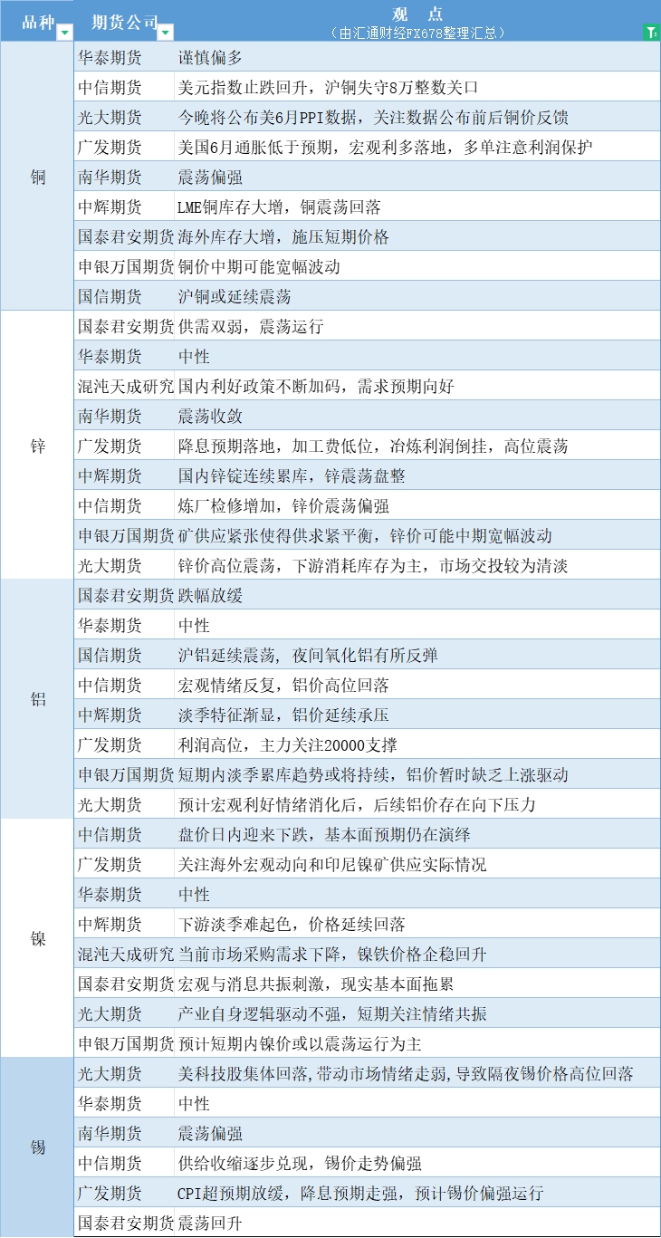 期货公司观点汇总一张图:7月12日有色系(铜、锌、铝、镍、锡等)