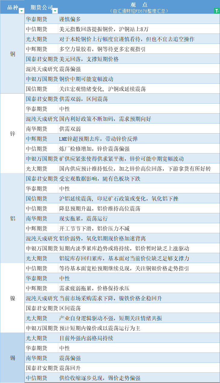 期货公司观点汇总一张图:7月11日有色系(铜、锌、铝、镍、锡等)