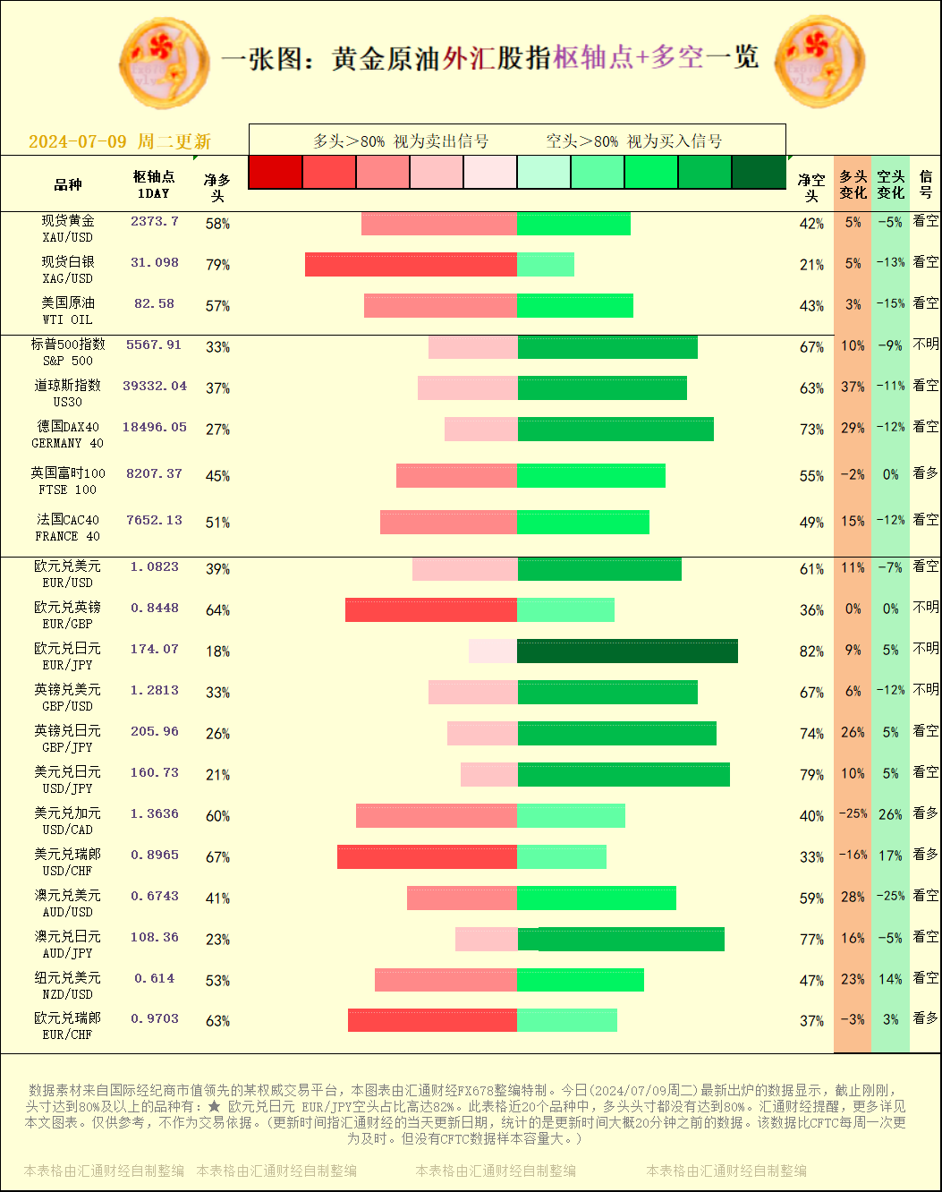 一张图:2024/07/09黄金原油外汇股指"枢纽点+多空占比"一览