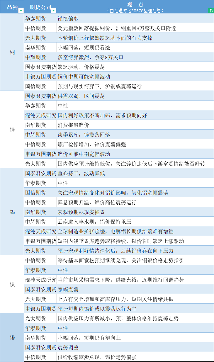 期货公司观点汇总一张图:7月9日有色系(铜、锌、铝、镍、锡等)