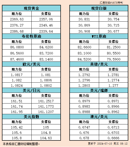 7月10日亚市支撑阻力:金银原油+美元指数等六大货币对