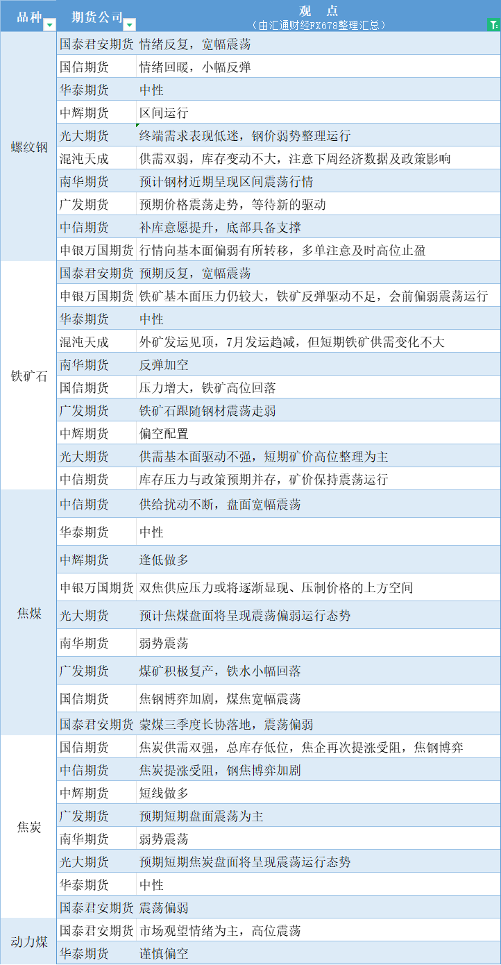 期货公司观点汇总一张图:7月8日黑色系(螺纹钢、焦煤、焦炭、铁矿石、动力煤等)