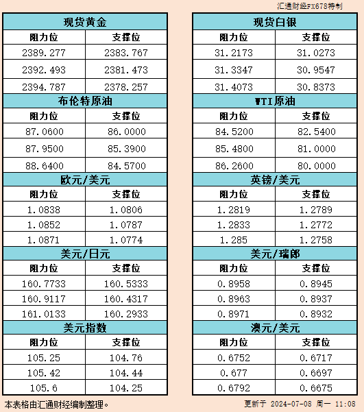 7月8日亚市支撑阻力:金银原油+美元指数等六大货币对