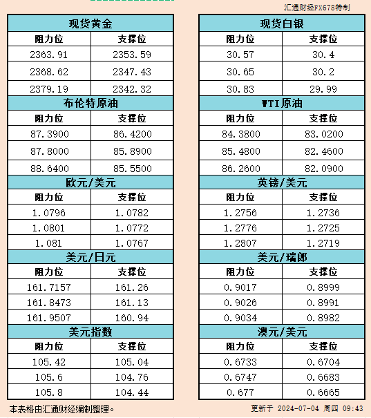 7月4日亚市支撑阻力:金银原油+美元指数等六大货币对