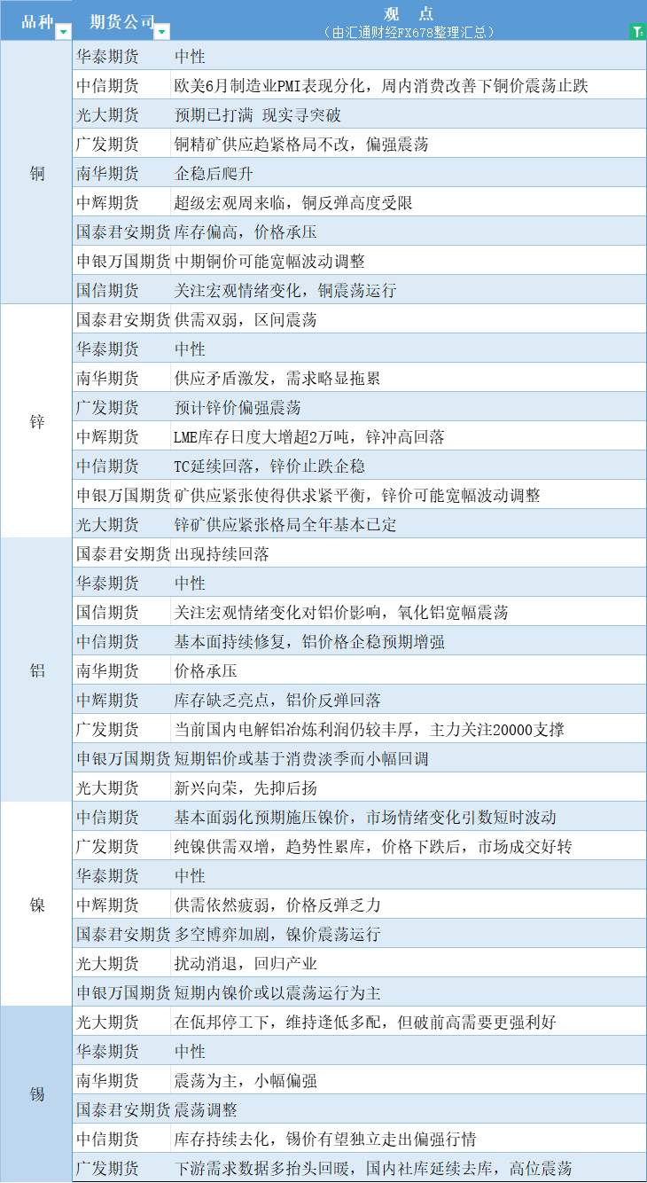 期货公司观点汇总一张图:7月1日有色系(铜、锌、铝、镍、锡等)