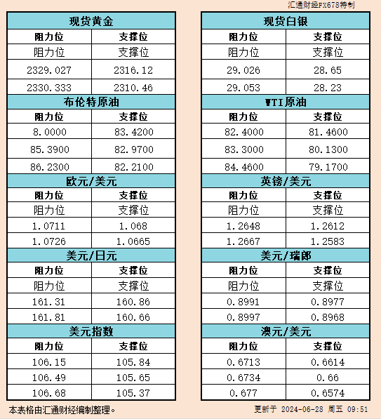 6月28日亚市支撑阻力:金银原油+美元指数等六大货币对
