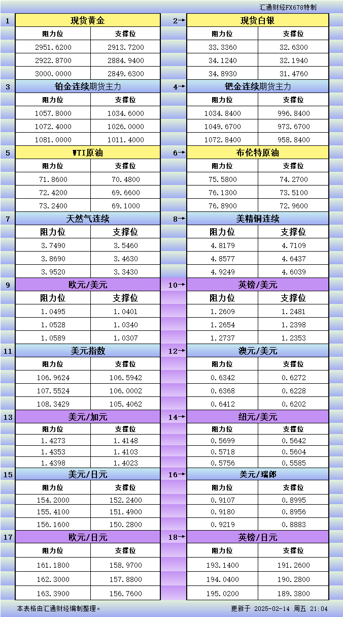 2月14日美市更新支撑阻力:18品种支撑阻力(金银铂钯原油天然气铜及十大货币对)
