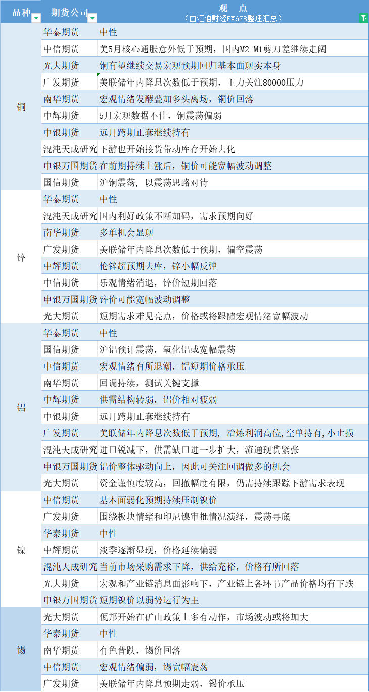 期货公司观点汇总一张图:6月18日有色系(铜、锌、铝、镍、锡等)
