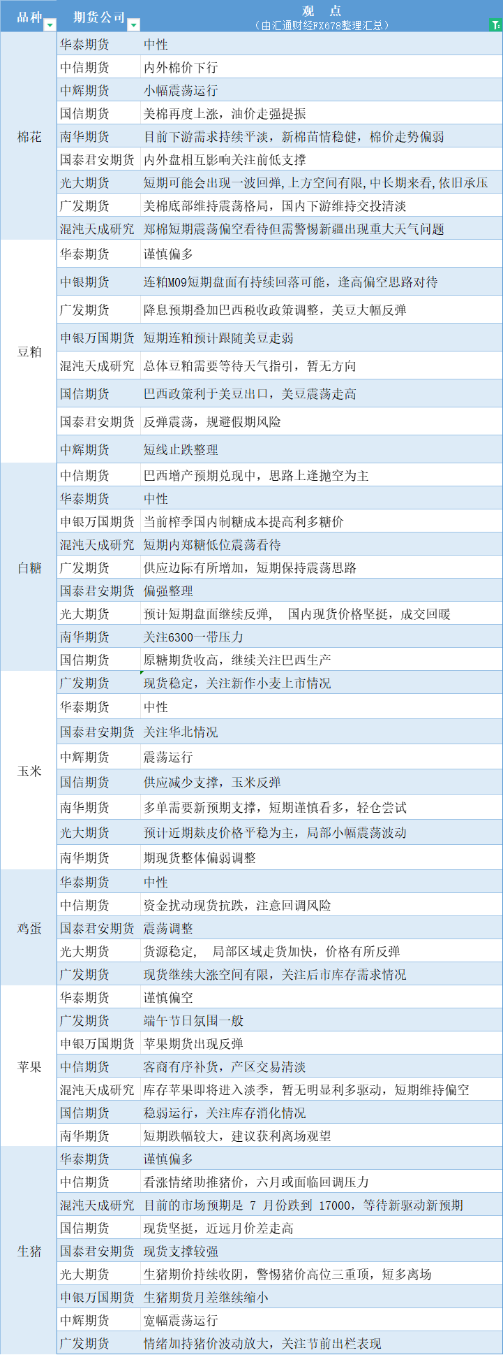 期货公司观点汇总一张图:6月7日农产品(棉花、豆粕、白糖、玉米、鸡蛋、生猪等)