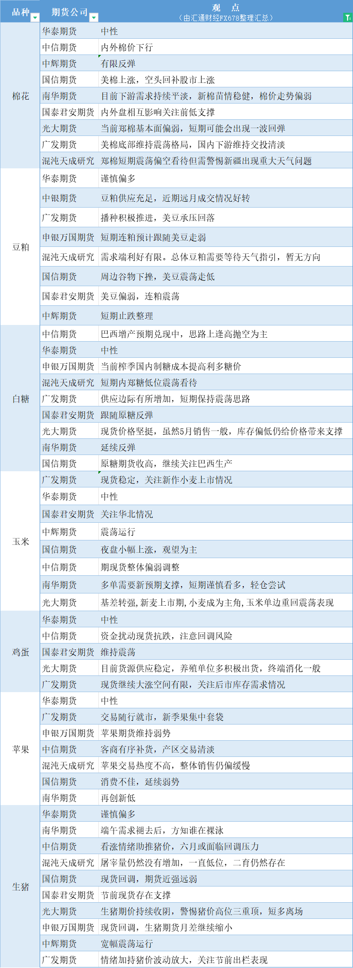 期货公司观点汇总一张图:6月6日农产品(棉花、豆粕、白糖、玉米、鸡蛋、生猪等)