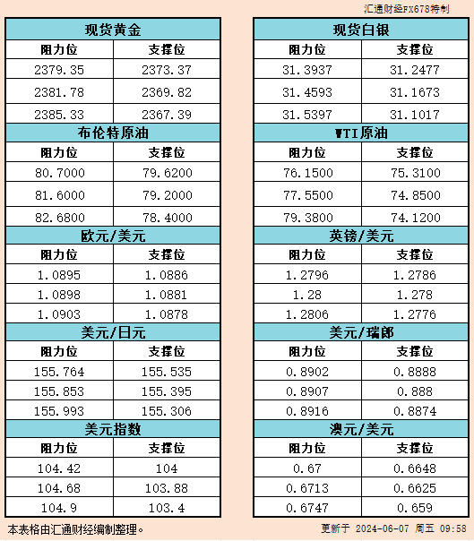 6月7日亚市支撑阻力:金银原油+美元指数等六大货币对