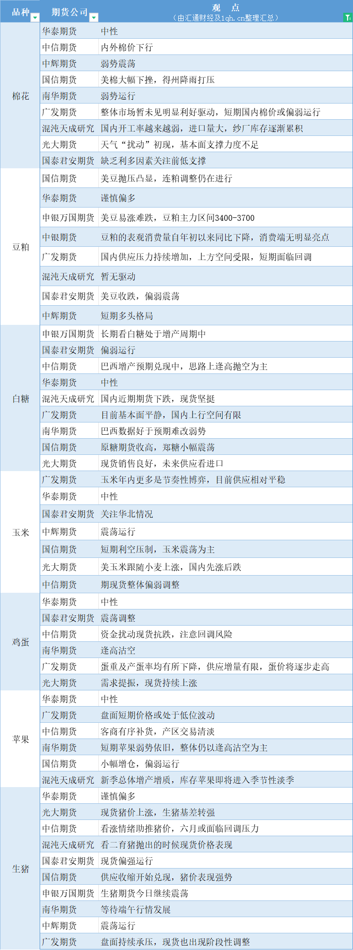 期货公司观点汇总一张图:6月3日农产品(棉花、豆粕、白糖、玉米、鸡蛋、生猪等)
