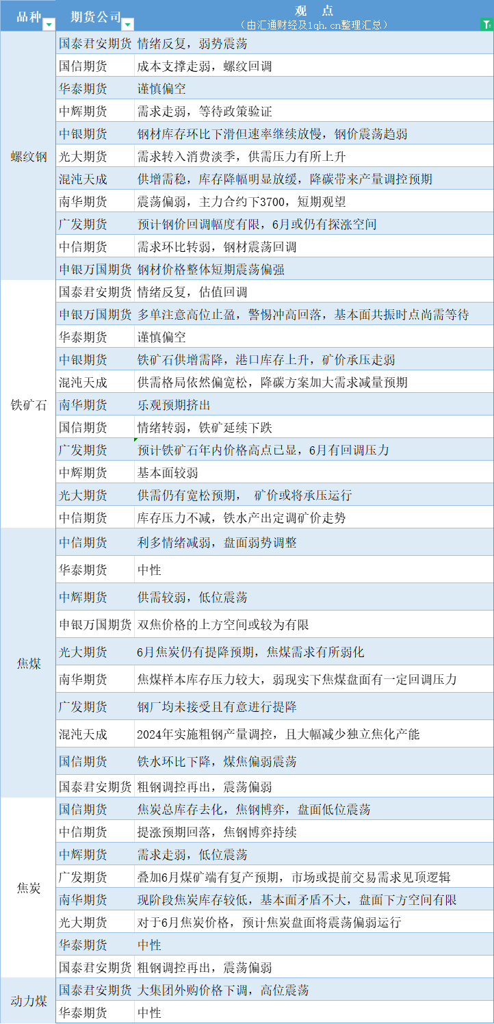 期货公司观点汇总一张图:6月3日黑色系(螺纹钢、焦煤、焦炭、铁矿石、动力煤等)