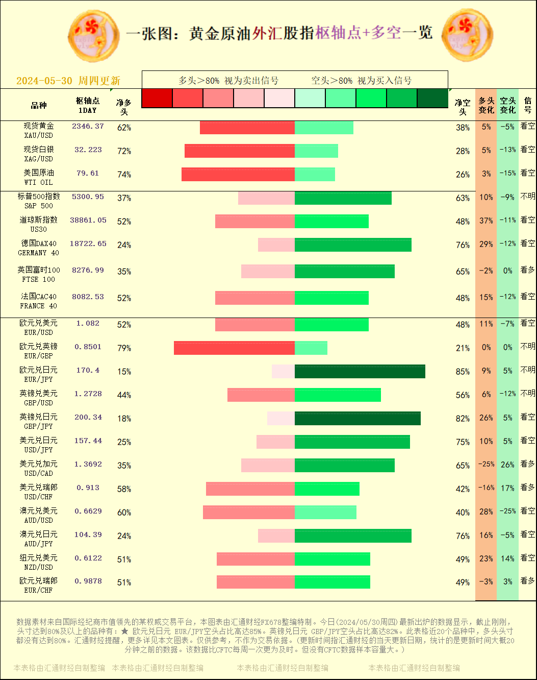 一张图:2024/05/30黄金原油外汇股指"枢纽点+多空占比"一览